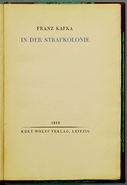 Een reiziger woont op uitnodiging van de commandant van een buitenlandse strafkolonie een executie bij; de officier die hiervoor instaat legt hem omstandig uit hoe het apparaat functioneert en hoe de jurisprudentie van de kolonie in elkaar zit. Boven alles blijkt zijn bewondering voor de vorige commandant, een mysterieus figuur die dit alles zo bepaald had, en voor het apparaat. De veroordeelde (een soldaat die zijn meerdere beledigd had) staat er zwijgend bij, hij verstaat het gesprek tussen de officier en de reiziger niet, maar toont soms wel enige belangstelling. De reiziger verbergt zijn afschuw voor het procedé niet maar kan zijn nieuwsgierigheid toch niet helemaal bedwingen en blijft naar de uitleg luisteren (het apparaat blijk op gruwelijke wijze erg traag te werk te gaan zodat het een lange doodstrijd is; deel van de executie is het graveren van het vonnis in de huid van het slachtoffer met de stalen naalden van een eg); maar als hij op het einde te kennen geeft dat hij het niet eens is met zo’n manier van werken, is de officier teleurgesteld dat hij hem niet heeft kunnen overtuigen en neemt hij de schuld op zich: hij pleit de veroordeelde vrij en installeert zichzelf in de machine, die hem op verschrikkelijke wijze ter dood brengt. Hierna verlaat de reiziger de kolonie.